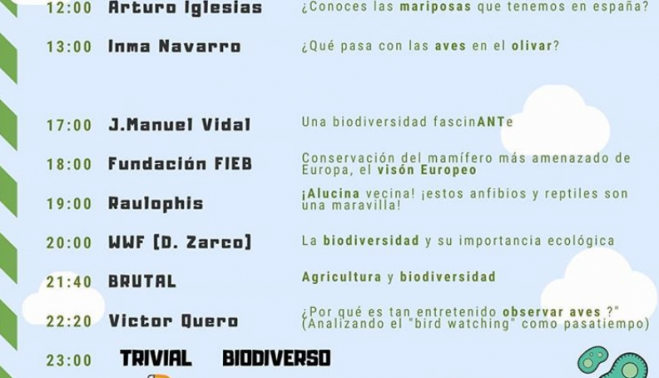 ¿Qué debo hacer si encuentro un ave en apuros?, ¿conoces las mariposas que tenemos en España?, el voluntariado en proyectos de conversación de tortugas marinas, ¿por qué conservar una mosca?… son algunos de los temas que se tratarán durante el Festival de la Biodiversidad, en el que participan expertos como David Zarco, de WWF Sevilla; Isabel Moreno, presentadora de Aquí la tierra (TVE); Elena Tena, investigadora experta en murciélagos; el biólogo Pablo Escribano; Arturo Iglesias, entomólogo y especialista en lepidópteros... y otros muchos expertos y expertas que se han sumado al cartel del evento.