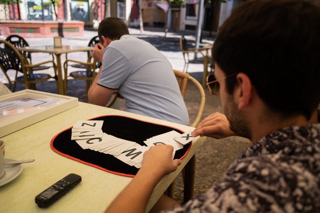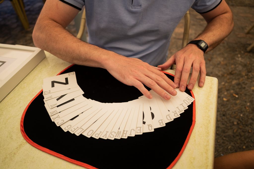 "¿Queréis que os haga un truco?", pregunta para acto seguido sacar una alfombrilla negra improvisada de una maleta. Sobre ella, unas cartas con todas las letras del abecedario —sin la ñ— y dos montones de 13, que pide que lavozdelsur.es baraje. El fotógrafo y redactor de este medio se miran, eligen una carta —la que más coraje os de, dice— y se la intercambian. Pero en el mentalismo ya se sabe, se sabe que él lo sabrá y así es. Tras barajar en varias ocasiones, los montes quedan en su sitio y el mago José Manuel hace que ambos pronuncien letra a letra. La H y la W. Lo sabía. En cambio, su truco en Murcia tuvo algo de diferente... y de peligroso, en teoría.