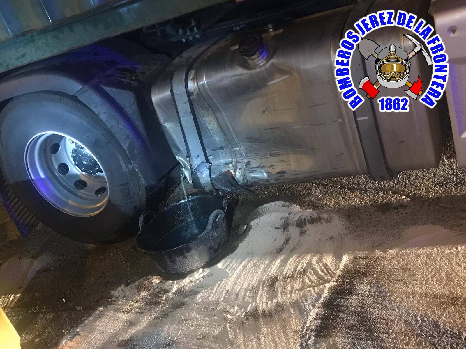 Tres vehículos de Bomberos del parque de Jerez y la Policía Local han tenido que intervenir al filo de las once de la noche de este pasado sábado tras el choque de un vehículo contra el tanque de gasoil de un tráiler aparcado en el entorno de Carrefour Sur, en la zona Sur de Jerez. Por el momento, se desconocen las causas de un accidente que no ha provocado daños personales y en el que la parte delantera del turismo quedó destrozada tras el impacto. Los efectivos del Cuerpo de Bomberos se han empleado a fondo para eliminar de la calzada el vertido de combustible ante el riesgo de incendio.
