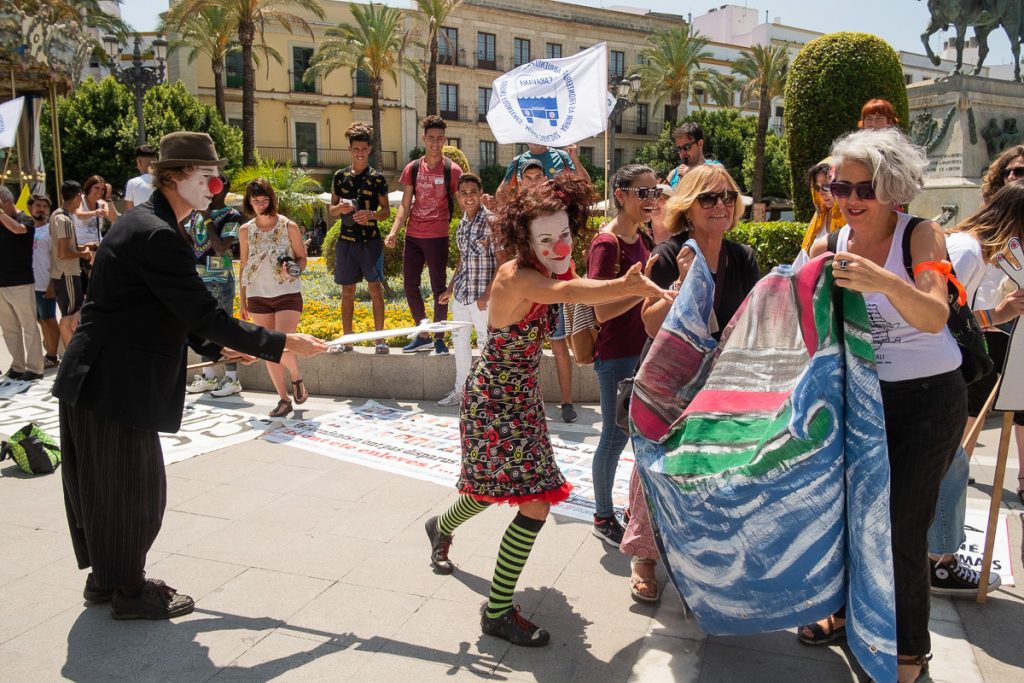 "Europa, canalla, abre la muralla", dice una marea de activistas, que se concentra en la plaza del Arenal de Jerez y camina hacia las puertas del Ayuntamiento de la ciudad. Allí, concentrados en semicírculo, despliegan varias pancartas, en los que se puede observar la huella de los diferentes pasos de esta caravana pro derechos humanos por diferentes ciudades andaluzas. Al micrófono y delante del consistorio,