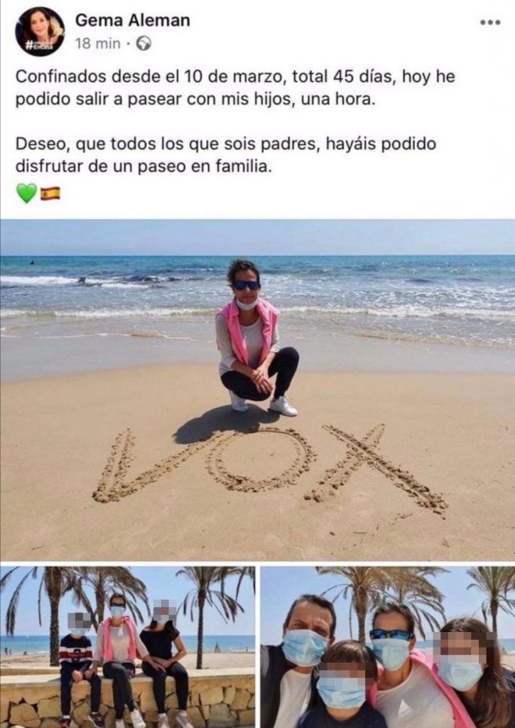 La concejala de Vox en el Ayuntamiento de San Juan de Alicante Gemma Alemán se ha delatado a sí misma como incumplidora de las normas del estado de alarma a través de una publicación en redes sociales. Esto ha tenido lugar el primer domingo en el que se ha permitido realizar paseos con niños convivientes.