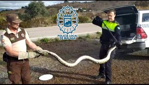 Agentes del Grupo de Protección de la Naturaleza (Grupona) de la Policía Local de Málaga, con la ayuda de un guarda rural de los Montes de Málaga, han capturado para su recuperación una serpiente de gran tamaño de raza pitón molurus. Los hechos tuvieron lugar sobre las 08.00 horas del pasado martes 2 de noviembre, después de que un vecino de la zona requiriera al guarda rural informándole de que había avistado una serpiente de grandes dimensiones, que no parecía autóctona de la zona, en las inmediaciones de la carretera MA-3111, que enlaza los núcleos de Olías y Colmenar, concretamente en el diseminado Santo Pitar.