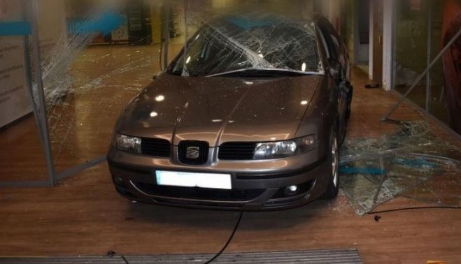 La puerta del establecimiento comercial fue violentada por un coche que se encontraba empotrado en el hall de entrada, rodeado de cristales procedentes de la puerta de acceso, cuando llegaron los agentes.