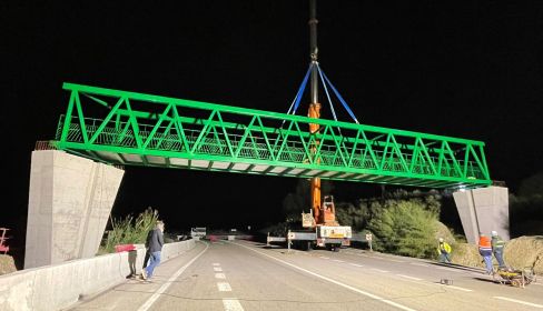 Esta pasarela es una de la tres previstas en los 24 kilómetros de trazado de las obras. La primera se colocó el pasado verano, cuando en una operación similar, se construyó un paso paralelo a la carretera para salvar el arroyo de la Guareña. Todavía queda pendiente la colocación de un tercer paso, también sobre la A-2003, a la altura del kilómetro 7, que mejore la interconexión de la vía con los caminos y senderos ciclistas.