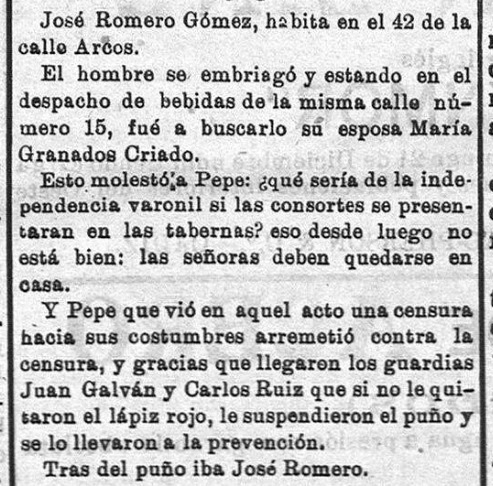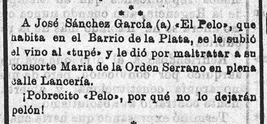 Otros dos casos de hombres borrachos que agreden a su mujer, en uno de ellos auxiliada por los vecinos. De nuevo, el tratamiento, entre "gracioso" e indolente, que de la noticia hace el periodista nos da a entender que lo habitual de estos hechos que se denuncian, les hacía ser ya rutinarios y cotidianos sin que se optará por parte de la prensa, por una condena taxativa de estos sucesos. (El Guadalete, 25 Nov. 1924).
