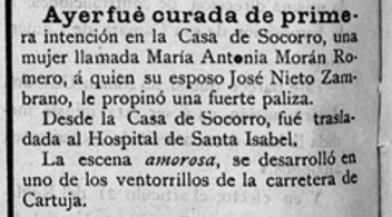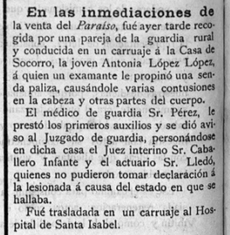La primera de ellas se refiere a una "paliza" a una mujer por su "ex-amante" en la venta del Paraíso, que se ubicaba junto a la rotonda del número "1", de la Ronda Este, con intervención de médicos, juez y con necesidad de hospitalización por las graves lesiones. Obsérvese que, como en todos los casos que siguen, se publicaba el nombre de los agredidos... y de los agresores. (El Guadalete, 3 julio 1901).