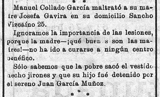 En este caso no es la esposa ni la hija. La agredida es la madre quien sufre las agresiones de su hijo. El periodista destaca el hecho de que la madre no haya ido a curarse... para no denunciar al hijo. (El Guadalete, 11 Dic. 1924)
