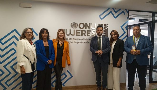 El delegado de la Zona Franca de Cádiz, Fran González, junto a la vicerrectora de Emprendimiento de ls UCA, Carmen Camelo, han visitado la sede de la organización ONU Mujeres Colombia durante el transcurso de su viaje al país con motivo de la participación del Consorcio gaditano en Innovazul Caribe 2024 y han mantenido un encuentro con la representante de la entidad, Bibiana Aido, quien lleva tres años al frente de la oficina de Naciones Unidas para las políticas de igualdad.