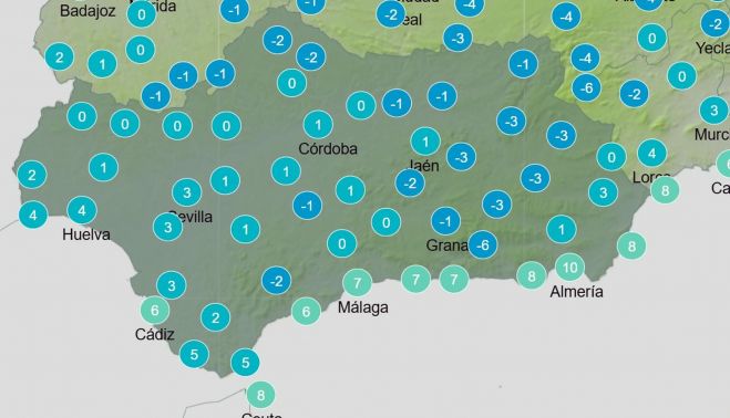Las mínimas y máximas previstas reflejan el ambiente frío: Granada registrará entre -2 y 6 ºC, Jaén entre 0 y 6 ºC, Córdoba 0 y 11 ºC y Sevilla 3 y 13 ºC, mientras que en la costa, Málaga alcanzará 12 ºC de máxima y Almería 13 ºC.
