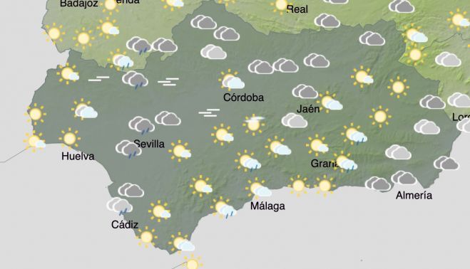 Las máximas más elevadas se esperan en Málaga y Sevilla, con 25 ºC, seguidas por Córdoba y Granada con 24 ºC. Jaén y Huelva se mantendrán en torno a los 22–23 ºC, mientras que Cádiz se quedará en 20 ºC. Los vientos, de componente oeste, serán flojos en el interior y moderados en el litoral.