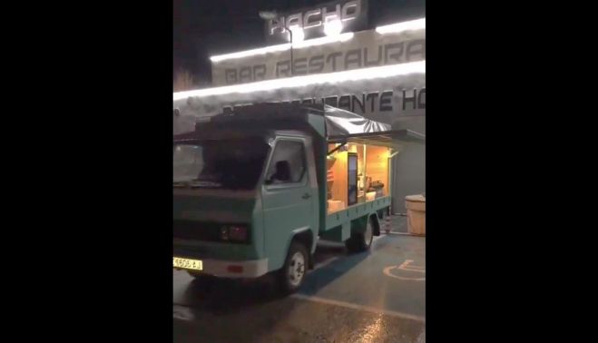 Para facilitar la labor de los transportistas, los propietarios han decidido ofrecer productos en el aparcamiento de esta habitual área de descanso. Una furgoneta de estilo track food ofrece comida y bebida gratis. "Importante, no admitimos dinero", indica un cartel junto al café.