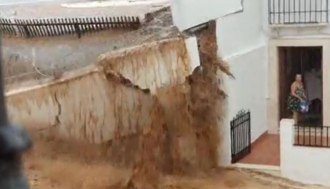 En el primero de los citados municipios, se ha producido un espectacular derrumbe con la crecida de inundaciones, derribando incluso un muro por el que fluía un torrente, llevándose a su paso vehículos y poniendo en riesgo a varias personas en el entorno.
