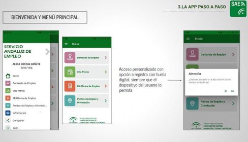 Con la nueva aplicación, también es posible localizar en el mapa las unidades de orientación de la red Andalucía Orienta y los puntos de empleo, así como sincronizar las fechas de renovación y citas con la agenda personal instalada en el dispositivo. Para acceder al aplicativo, una vez descargado en el dispositivo, es necesario un usuario y contraseña que coincide con el de acceso validado al Área de Gestión ubicada en el portal del SAE. En caso de no tener usuario, se debe acudir a la oficina de empleo.