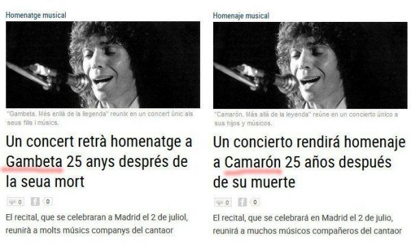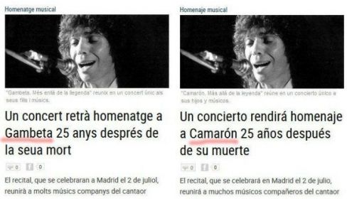 La leyenda del cante flamenco, Camarón de la Isla, se convierte en “Gambeta” gracias a una traducción al valenciano del diario Levante. El blog Strambotic del medio digital Público se hizo eco del error, que ya lleva circulando todo el día en las redes sociales. “Un contert retrà homenatge a Gambeta 25 anys després de la seu mort”, tituló la edición en valenciano del diario Levante, traducción literal —demasiado literal— del original en castellano, “Un concierto rendirá homenaje a Camarón 25 años después de su muerte”.