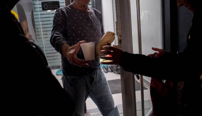 "Mucha gente quiere colaborar con nosotros viniendo a ayudar. Tenemos incluso listas de espera, porque realmente no hay trabajo para todos", nos cuenta May mientras ultima los preparativos. En cuanto al perfil "hay de todo: cristianos que están convencidos de que este es el ejemplo que deben seguir para predicar con el ejemplo, hay mormones, un musulmán, monjas y ateos. Aunque Calor en la Noche naciera en un entorno católico como es La Salle, aquí viene a prestar ayuda quien quiere, independientemente de cuáles sean sus creencias", asegura. Cuando nos disponemos a salir del local, en la calle Regimiento de Infantería, nos topamos con un Viacrucis. La paradoja del buen samaritano. Como si formaran parte del desfile, un grupo de usuarios se amontona en la puerta y acaban pasando al comedor para resguardarse del frío y del incienso. Se reparten los primeros vasos de caldo y café de la noche.