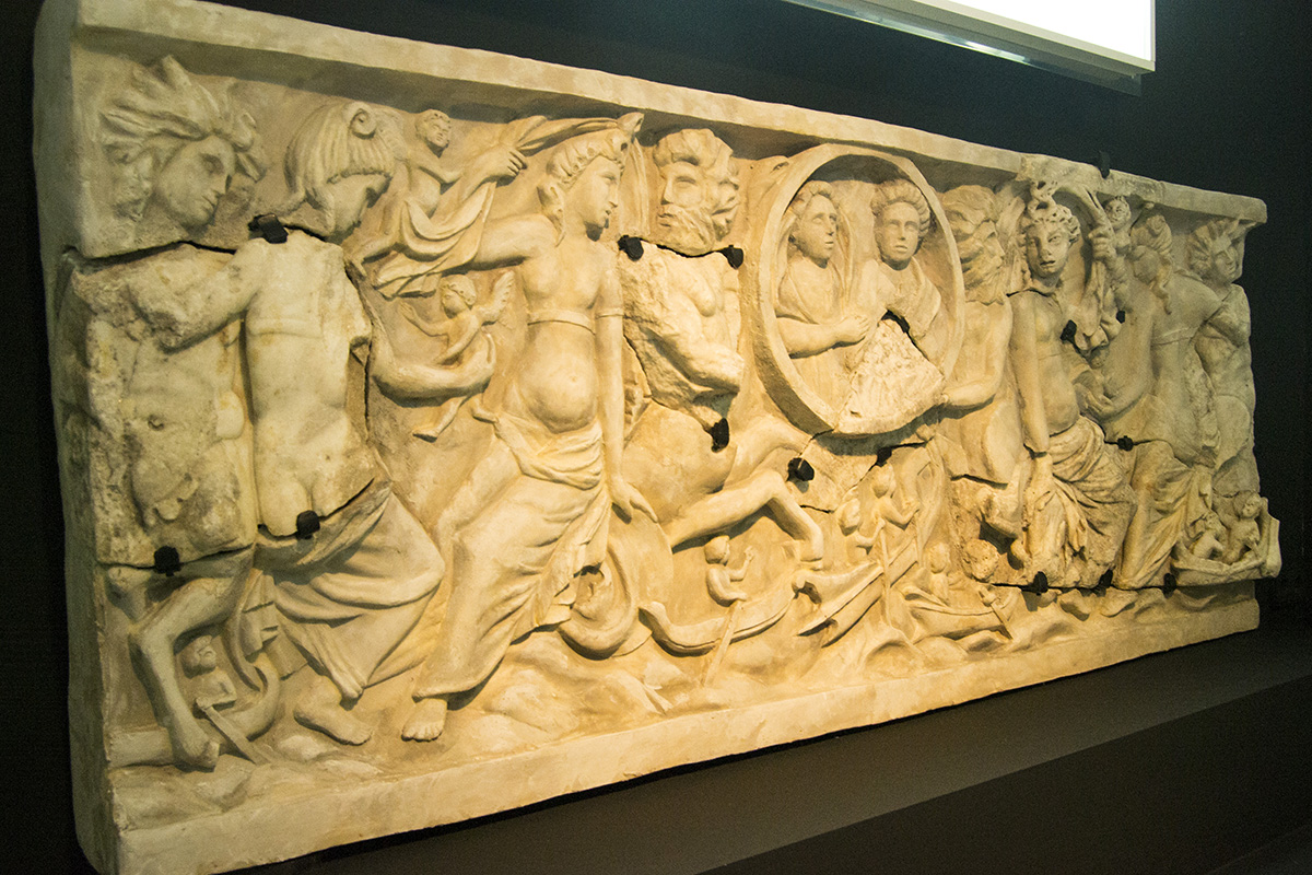 5. Un sarcófago ‘guadiana’. Aparece y desaparece. Este frente de sarcófago permanece expuesto en la sala seis. La pieza apareció a comienzos del siglo XVII en Medina Sidonia y permaneció en dicha población, en la sacristía del convento de los Franciscanos Descalzos hasta 1763. En esta fecha fue adquirida por el Marqués de la Cañada quien – tras cortar el frontal- la traslada al gabinete de antigüedades que poseía en su palacio de El Puerto. En esta localización fue dibujada y permaneció al menos hasta la década de los 70 del siglo XIX, fecha en la que se le pierde la pista, dándosele ya por desaparecida a principios del siglo XX.