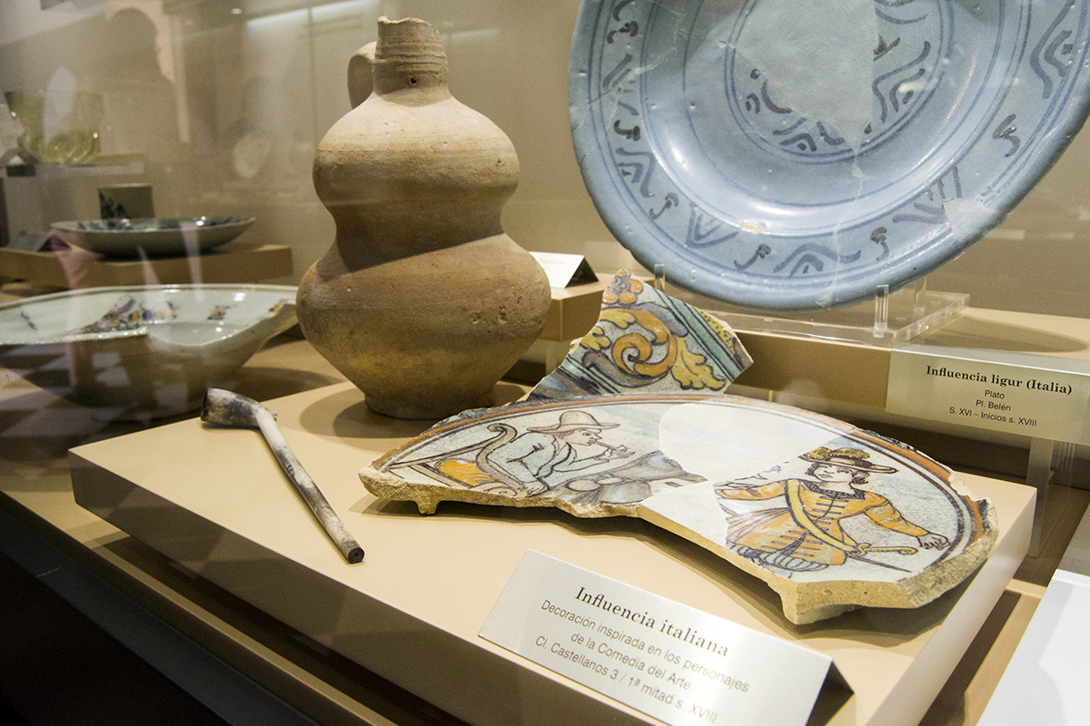 9. Binomio: arqueología y comedia. Desde el siglo XVI se hacían representaciones de la Comedia del Arte – teatro popular italiano- por parte de compañías itinerantes. De esto queda constancia en esta fuente de grandes dimensiones realizada en los alfares de Triana. La pieza tiene una profunda huella de las tradiciones decorativas de la cerámica centroiltaliana de la segunda mitad del siglo XVI. Representa una escena de la Comedia del Arte en la que aparece a la izquierda el joven enamorado con un bastón y una espada; en el centro el doctor, sabelotodo, amante de la comida y la bebida; y en el extremo derecho, sentado a la mesa, el personaje astuto y amante de la buena vida vestido de persona de la calle.