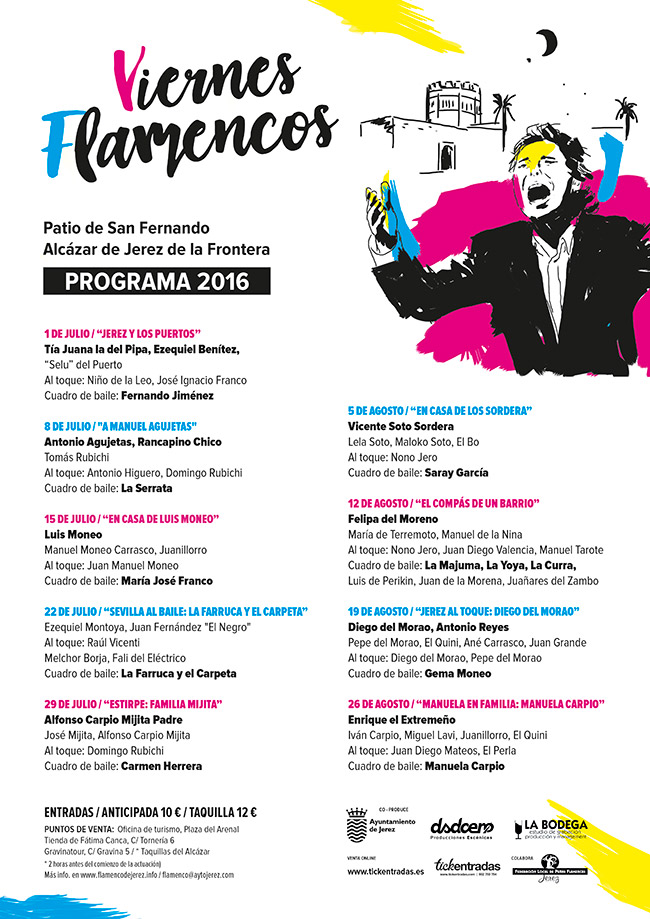 Los Viernes Flamenco mantienen este mes una extensa programación. El 5 de agosto hay un gran cartel que invita a entrar En casa de los Sordera. Vicente Soto será el protagonista indiscutible aunque también estarán artistas como Lela Soto, Maloko Soto y El Bo, bajo el toque de Nono Jero y el baile del cuadro de Saray García. El 12 de agosto la cita temática llevará por nombre El compás de un barrio, y el cartel se vuelca con La Asunción y Santiago. Al cante estarán María de Terremoto, Manuel de la Nina y Felipa del Moreno; al toque estarán Nono Jero, Manuel Tarote y Juan Diego Valencia, mientras que el apartado del baile lo protagonizarán La Majuma, La Yoya, La Curra, Luis de Perikín, Juan de la Morena y Juañares del Zambo. El penúltimo Viernes, el 19 de agosto, lleva el epígrafe Jerez al toque, bajo el liderazgo de Diego del Morao y Pepe del Morao. El cante lo pondrán Antonio Reyes, El Quini, Ané Carrasco y Juan Grande. El baile será de Gema Moneo. Por último, el 26 de agosto, la bailaora Manuel Carpio se reúne en familia, bajo el cante de Enrique el Extremeño, Iván Carpio, Miguel Lavi, Juanillorro y El Quini; y el toque de Juan Diego Mateos y El Perla. La entrada anticipada para los Viernes Flamenco tiene un precio de 10 euros y se puede conseguir en la Oficina de Turismo de la plaza del Arenal, en la tienda de Fátima Canca (Calle Tornería, 6), en Gravinatour (Calle Gravina, 5), y en las taquillas del Alcázar.
