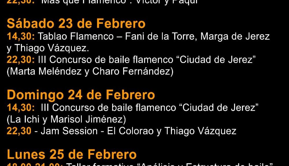 Este año el festival está dedicado a la figura de Antonio Chacón, en el 150 aniversario de su nacimiento. Una de las actividades será precisamente la presentación del libro Don Antonio Chacón, con José Manuel Gamboa y Carlos Martín Balllester, el martes 26 a las 20:00h, y la proyección de un documental sobre el artista, el miércoles 6 de marzo a las 21:00h. Sin embargo, es el concurso de baile "el plato estrella" del festival, ya que además de duplicar sus participantes, contará con doce fases clasificatorias, ofreciendo un variado programa de baile durante las dos semanas de transcurso del certamen, hasta el 8 de marzo, día de la final. En este concurso, el III Concurso de Baile Flamenco Ciudad de Jerez, participarán bailaores y bailaoras de hasta ocho nacionalidades distintas: España, Marruecos, China, Inglaterra, Argentina, México, Francia y Brasil.