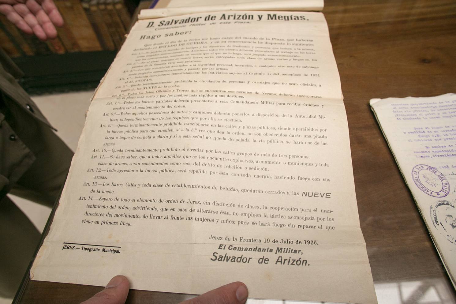 Más del siglo XX, en este caso un curioso a la par que inquietante documento. Nada menos que el bando de guerra que el comandante Salvador de Arizón publicó en Jerez el 19 de julio de 1936, un día después del alzamiento. En el mismo se advierte a la población de que las cosas ya han cambiado, por lo que se decreta un listado de cosas que había que cumplir a rajatabla si no se querían tener problemas. Entre estos puntos destacamos los que dicen que “todos los buenos patriotas deberán pasar por esta comandancia para recibir órdenes sobre el mantenimiento del orden”; la obligación de los propietarios de armas a entregarlas a la Guardia Civil o el cierre de los bares a partir de las 9 de la noche.