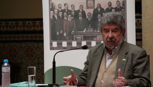 Isidoro Moreno en el centenario de la Asamblea de Ronda. Foto: Sebastián Chilla.La Junta de Andalucía...Un ejemplo de ello, dado en el coloquio de esta tarde, es el cambio del Día de Andalucía del 4 de diciembre al 28 de febrero. Es otro caso de banalización de los símbolos, con objeto de desactivar. Y se desactiva cuando la gente se convence de que las instituciones no sirven para nada más que para construir todo un aparato de nuevo caciquismo con el que no se le mete mano a los problemas. Incluso los nuevos contenidos del Estatuto de Autonomía, que se aprueba en 1981, no son el resultado del 28 de diciembre o del 4 de diciembre, sino del 23 de febrero, del 81, del golpe del Estado de Tejero y compañía, y de los posteriores acuerdos de los partidos políticos para plegarse a esos intereses. Llevamos treinta y tantos años de desencanto y de desafección con respecto a lo que se vende a la gente como autonomía o como gobierno andaluz.