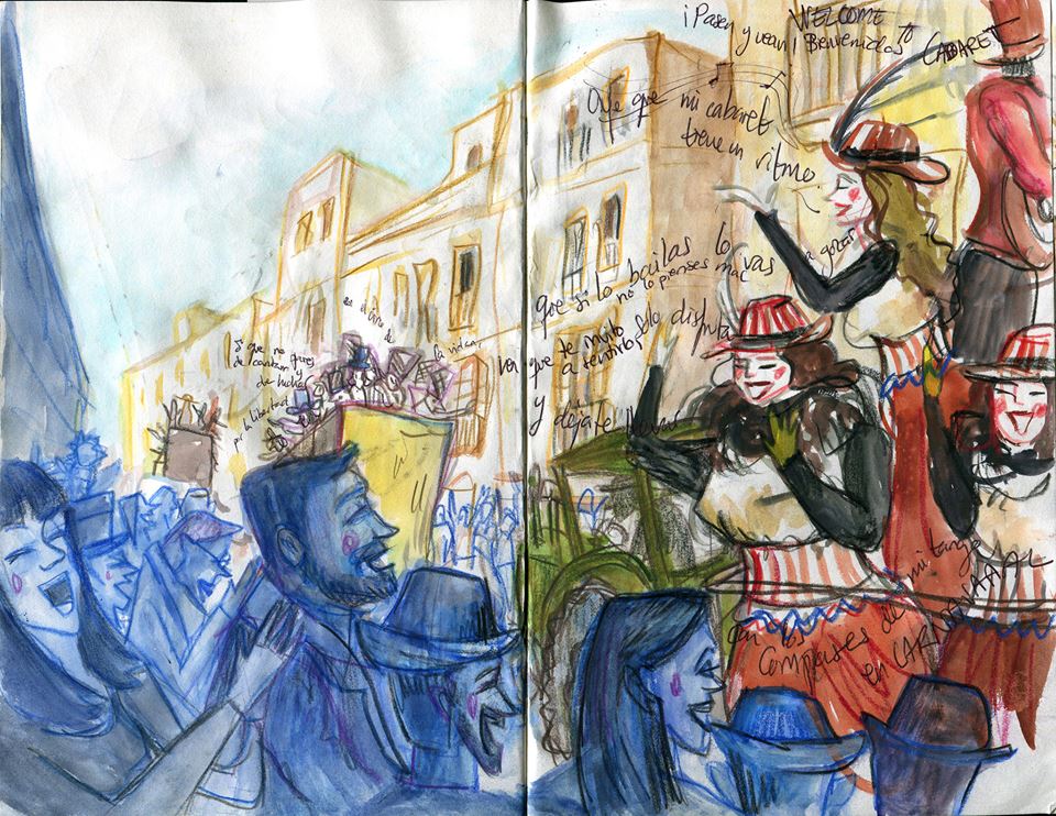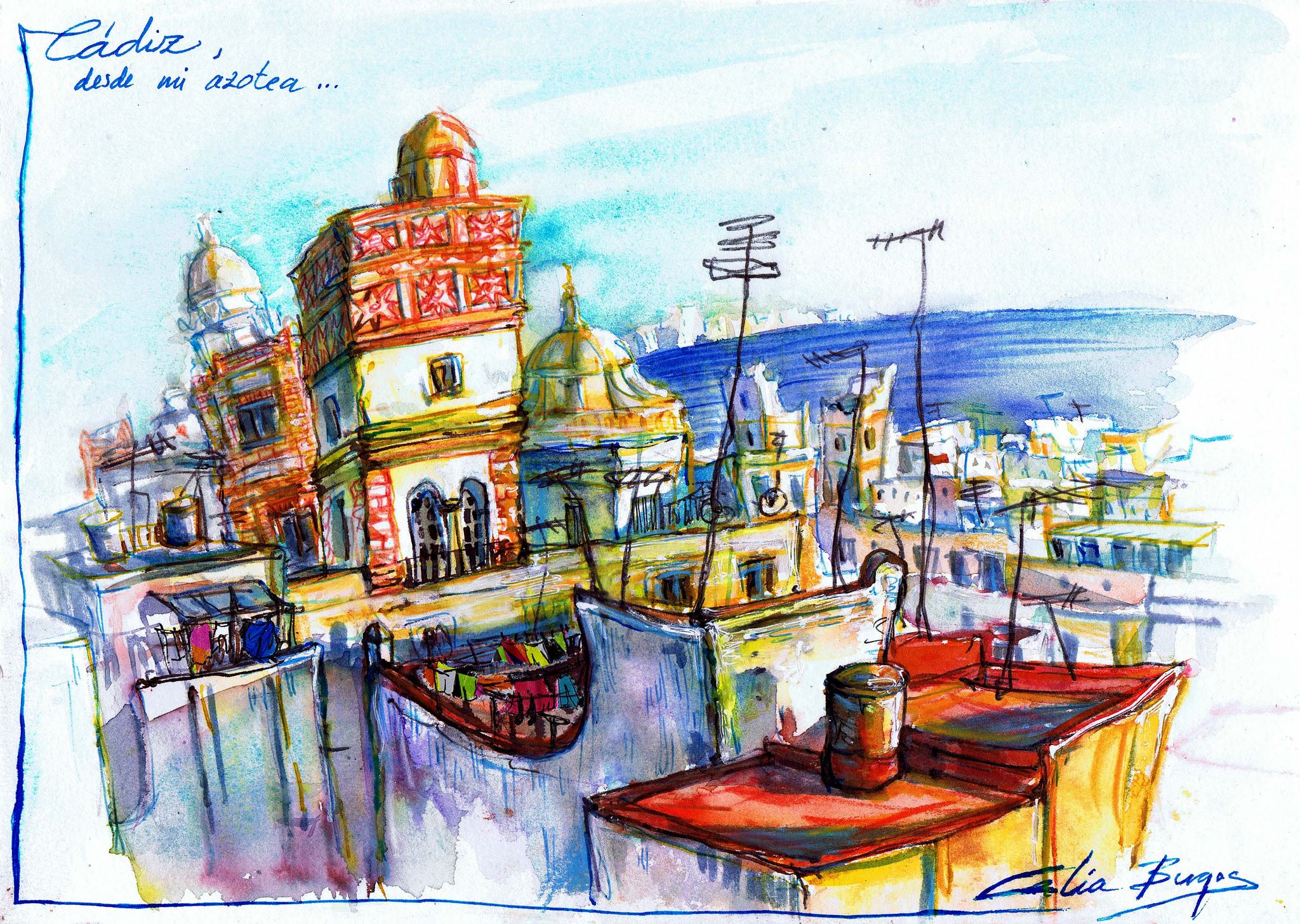 Celia, licenciada en Bellas Artes en la Universidad de Sevilla, da clases de dibujo en un instituto de Chiclana, y para ella la experiencia con los sketchers "te hace saborear cada momento del que formas parte, puesto que capturas el entorno y los instantes que vas viviendo". "Algo tan sencillo -abunda- como un cuaderno y un lenguaje universal como es el dibujo puede ser una herramienta de comunicación sin límites y una forma de viajar a cualquier rincón del planeta desde múltiples miradas". En su portada de facebook tiene un sketch de la madrileña plaza de Callao pero en su colección hay principalmente estampas gaditanas de vistas aéreas y días de carnaval.