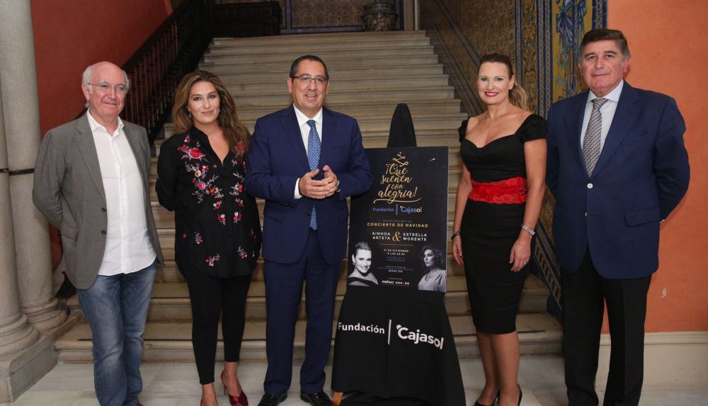 La soprano guipuzcoana Ainhoa Arteta (Tolosa, 1954) y la cantaora granadina Estrella Morente (Las Gabias, 1980) han iluminado, nada más entrar, el vestíbulo de la sede de la Fundación Cajasol, en la sevillana plaza de San Francisco. Allí ha tenido lugar la presentación de la gira nacional de la nueva edición de ¡Que suenen con alegría!, mucho más que un concierto de Navidad. Entre un nutrido grupo de periodistas y gráficos, ambas han estrechado sus manos, se han abrazado, han lucido su mejor sonrisa y han desenvuelto el regalo navideño que protagonizarán durante las próximas fiestas. La nueva versión del proyecto artístico ideado y dirigido por Francisco López, ha logrado unificar sus siempre frenéticas agendas durante algo más de una semana de finales del próximo diciembre para integrar sus voces en un concierto de Navidad "con los cánticos de nuestra tierra, pero con un concepto moderno y actual", como ha explicado el propio director de escena cordobés. Un espectáculo de alrededor de hora y media en el que más de la mitad de su metraje está previsto que esté compuesto por duetos entre Arteta y Morente, una experiencia inédita hasta la fecha.