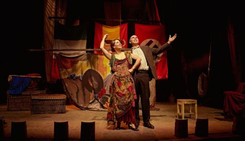 La escenografía muestra tres banderas que representan la dictadura de los diferentes fascismos de aquella época: el italiano, el alemán y el español. Y en esa singular trama donde Carmela y Paulino se ven forzados a improvisar una velada teatral para celebrar la derrota del “enemigo” en la villa de Belchite.