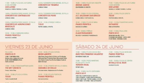 También estarán presentes en la capital gaditana intérpretes y grupos como Manuel García, Coral Salesiana San Ignacio, Tulus, Catarsis, Claustrovadores, Kino Maján, Wild Mojarras, Tanan, Roda Viva, Enrique Ayala, Camerata de Plectro a Tempo, entre otros. El Festival de la Música es una iniciativa de la Fundación Municipal de Cultura junto al Conservatorio de Música Manuel de Falla, que volverá a colaborar en el programa aportando las actividades musicales de fin de curso, y lo hará este miércoles, a partir de las 18 horas, en su propio auditorio. Asimismo, el Centro Municipal de Arte Flamenco de La Merced también aportará el espectáculo La Pompa Jonda, de flamenco electro jondo.