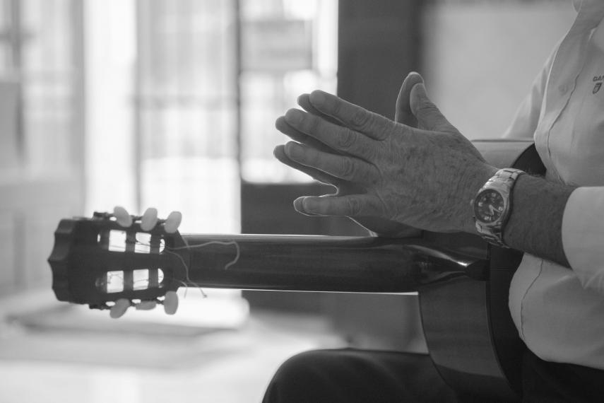 Manuel, guitarra en mano, gesticulando durante la entrevista.