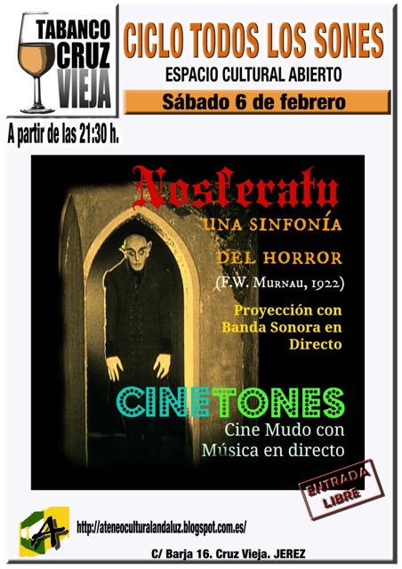 Cine mudo con música en directo. Ni estamos en la prehistoria del Séptimo Arte ni la iniciativa es nueva, pero sí es cierto que costaría saber si recientemente se había puesto en práctica en Jerez tan singular experiencia. El Tabanco Cruz Vieja, configurado como espacio cultural abierto y sede del Ateneo Cultural Andaluz, celebra este sábado 6 de febrero, a partir de las 21:30 horas, un encuentro con el cine y la música en vivo que no dejará indiferente y que además tendrá entrada totalmente libre y gratuita. En la pantalla de este local de la calle Barja, en pleno corazón de San Miguel, se proyectará Nosferatu, una sinfonía del horror la versión libre del Drácula de Stoker que F. W. Murnau rodó en 1922, una de las grandes obras maestras de la historia del cine silente.