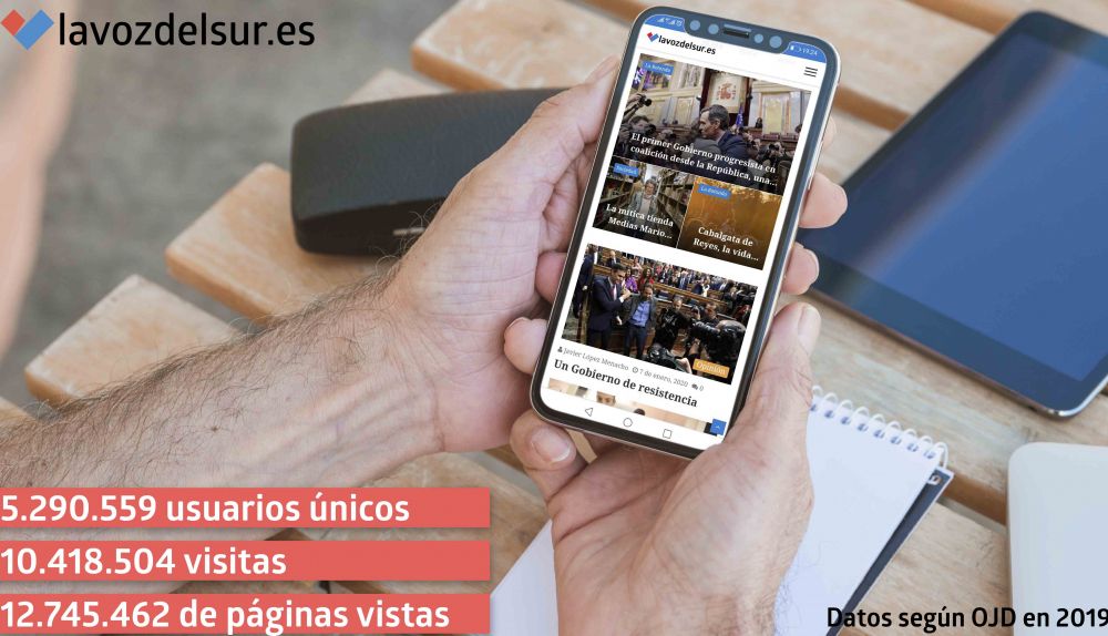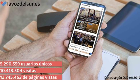 lavozdelsur.es, cabecera periodística digital andaluza que cumple en enero de este 2020 seis años y está editada por la sociedad compuesta por trabajadores y mecenas Comunicasur Media SL, ha cerrado 2019 con un total de 5.290.559 usuarios únicos y 10.418.504 visitas, con 12.745.462 de páginas vistas en este periódico digital que se ha consolidado como uno de los principales referentes informativos de ámbito andaluz. El incremento de la audiencia frente al año anterior ha sido de un 65% más en el caso de las visitas, un 61% más en cuanto a usuarios únicos, y un 56% más en relación con las páginas vistas.