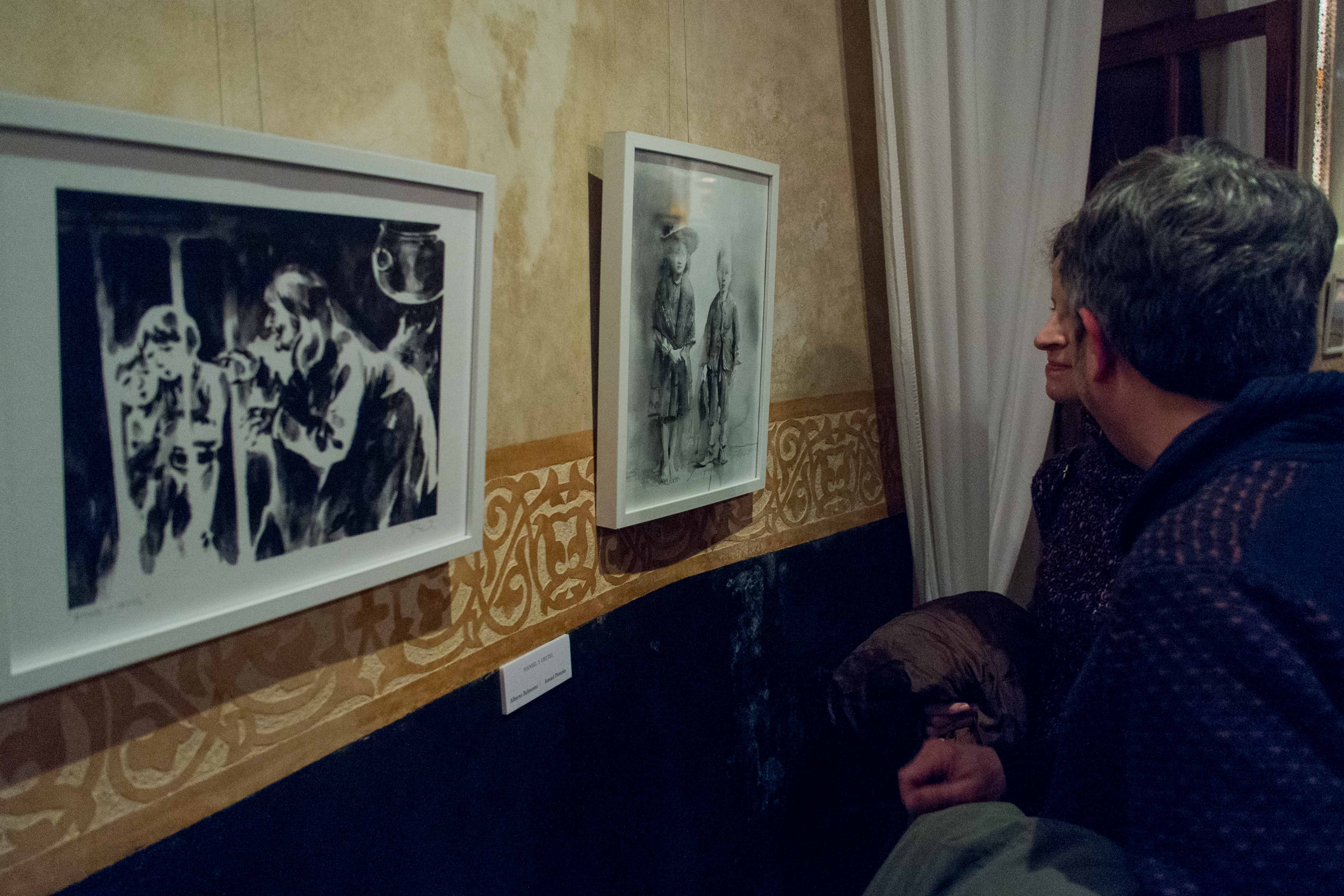 Tras las palabras de presentación, seguimos conversando con Fernando Pinteño sobre el origen de esta muestra: “La idea surgió como un ejercicio de estilo, para comparar estilos distintos, no en el sentido competitivo, sino para aprender generosamente unos de otros, dejando a un lado el ego… Confrontar el estilo en un mismo cuento es algo muy interesante porque te da dos puntos de vista.” Respecto al trabajo de coordinación y selección nos explicó que: “La elección de los cuentos fue algo muy caótico, a través de Facebook. Todos estamos conectamos y fuimos eligiendo los cuentos que queríamos. Uno elegía, otro cogía el testigo… y lo íbamos apuntando. Sólo hubo una condición. Como algunos sugirieron relatos cortos para adultos, y eso no cuadraba, hubo que restringirlo y pedir que fuesen cuentos populares clásicos, infantiles, para que viniera bien el Éranse dos veces”. Y el reto planteado a los artistas ha dado excelentes frutos: “El resultado lo estoy viendo ahora. Conocía sólo algunos trabajos, pero muy pocos. Y me encanta, porque son gente muy buena". El ámbito de la ilustración de libros es un terreno muy fértil para los creadores: “De hecho, algunos de estos artistas ya han ilustrado para editoriales como Santillana, Edelvives… Es un campo interesante para los ilustradores.”
