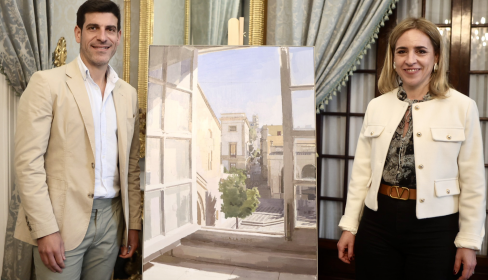 La imagen de las vistas desde una ventana a la céntrica Plaza de la Asunción, en Jerez, ilustra este año 2024 el Día de la Provincia de Cádiz. El cuadro es obra del pintor Eduardo Millán quien, junto a la presidenta de la Diputación, Almudena Martínez, y el vicepresidente primero, Juancho Ortiz, han presentado la pintura con la que este año la administración provincial conmemora el aniversario de la proclamación de la Constitución de Cádiz en 1812.