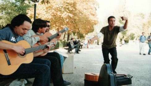 El encuentro improvisado acabó convirtiéndose en una sesión espontánea de música callejera. “Para no perder la oportunidad de volver a verles, les ofrecí hacerles fotos. Ni cortos ni perezosos, a la luz del Lorenzo, desenfundaron sus guitarras y Teto su cajón, colocaron en el suelo una de las fundas para que les echaran algunas monedas, se colocaron en un banco y empezaron a tocar. Yo saqué mi antigua cámara réflex analógica de mi bolsa y comenzó el espectáculo”, narró el productor.