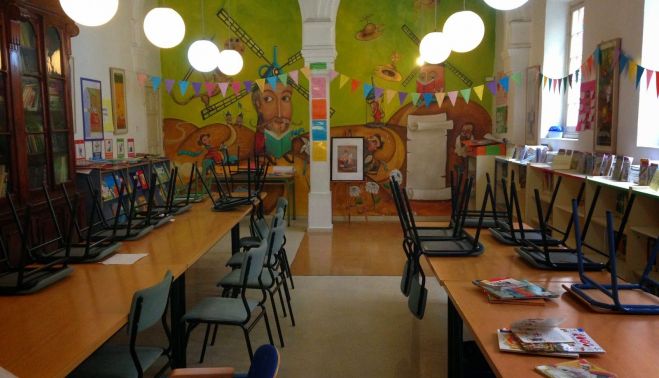La escuela femenina de Santa Teresa y la de niños Miguel de Cervantes fueron los precedentes que configuraron en tiempos de la II República, concretamente 1932, la constitución del colegio público Miguel de Cervantes. La incapacidad de albergar tantos alumnos en este centro hizo que tuviera dependencias adscritas a él así como un patio de recreo que invadía el solar de lo que fue el antiguo Teatro Eslava. A día de hoy, el colegio sigue albergando a párvulos y alumnos de enseñanza primaria en un privilegiado sitio de la ciudad.