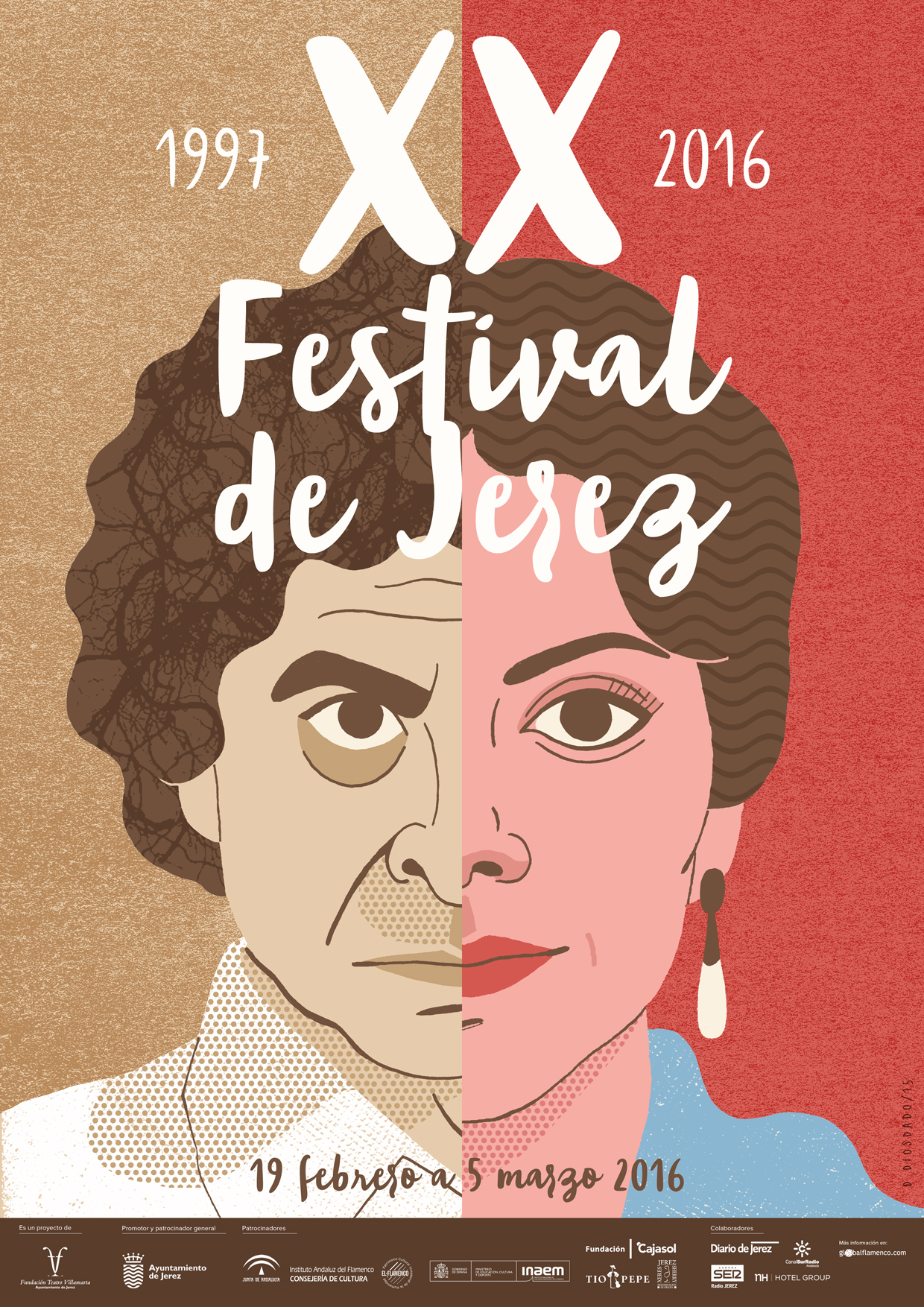 Uno de los secretos más celosamente guardados de la vigésima edición del Festival de Jerez ha sido su cartel. La obra, firmada por el artista jerezano Daniel Diosdado y que ha sido desvelada este miércoles durante la presentación de la programación oficial, condensa dos décadas de muestra de baile flamenco y danza española en un rostro bicéfalo compuesto por Mario Maya, uno de los maestros coreógrafos que ayudó en su momento a engrandecer el certamen, y Eva Yerbabuena, Premio Nacional de Danza y bailaora que será la encargada de alzar el telón del evento en 2016.