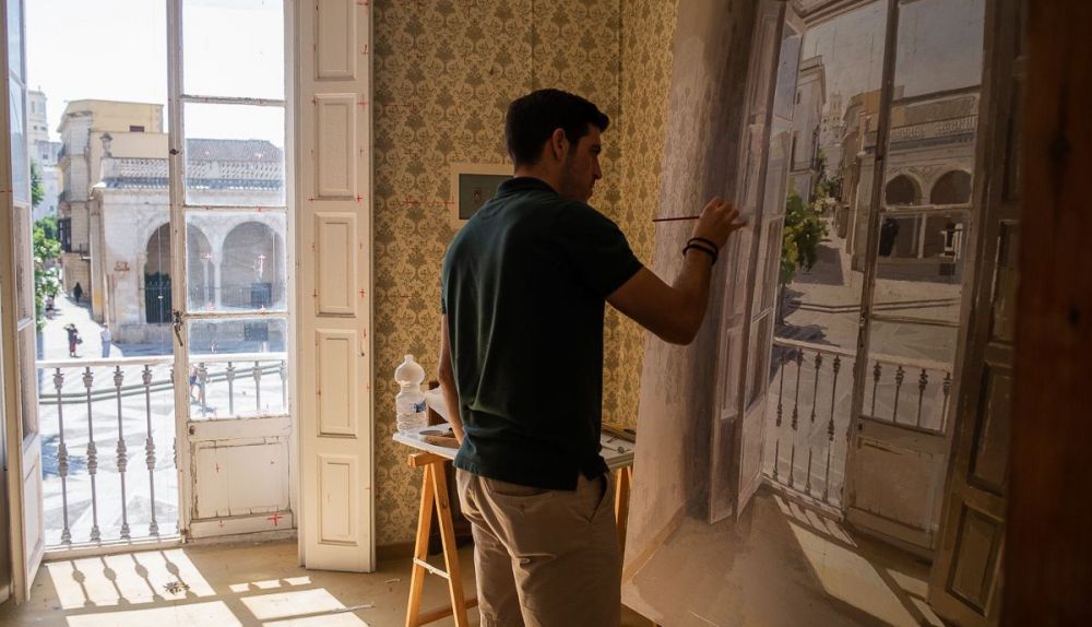 Bendecido por el mismísimo maestro del realismo Antonio López —que lo ha elegido para que su obra forma parte del primer museo de realismo de España, que abrirá a finales de 2020 en Almería—, entre óleos y lienzos, Eduardo Millán Sañudo, pintor jerezano de 40 años, recibe a lavozdelsur.es en su estudio situado en plaza de la Asunción para acercarnos a su universo artístico. Una casa con olor a antiguo que despliega un sinfín de sensaciones al entrar por su gigantesca puerta y subir sus elegantes escalones. Y es que una vez allí dentro, es fácil saber porqué el pintor ha elegido este espacio para trabajar en su última obra ambientada en la plaza que ve desde uno de los balcones.
