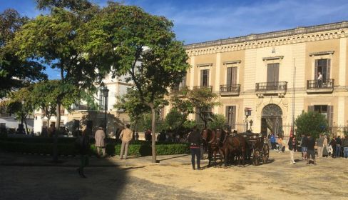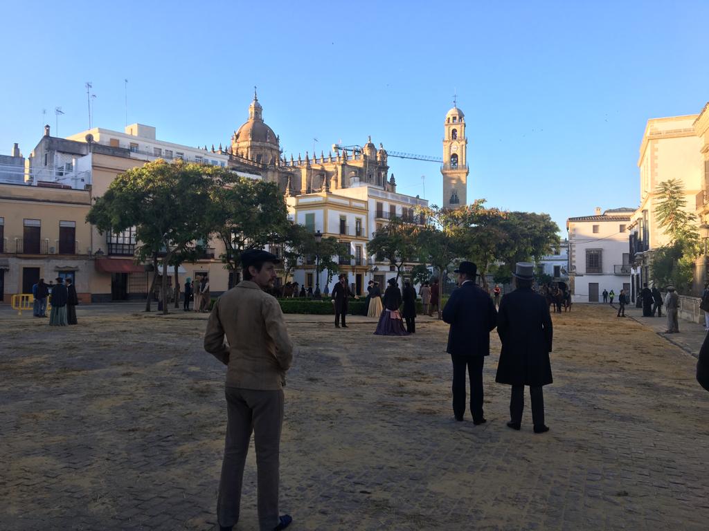 Después de un par de semanas de rodaje en las viñas —concretamente, en El Corregidor y más tarde en el palacio de Campo Real—, el rodaje de la serie La Templanza, basada en la novela de la escritora María Dueñas, acumula varias semanas de filmación en el centro histórico de Jerez. Muchas de las calles y plazas del centro han vuelto al siglo XIX para adaptarse a la época en la que se desarrolla una serie que producen Atresmedia Studios en colaboración con Boomerang TV y podrá verse en Amazon Prime Video en 2020. Este martes, toda la zona del Arroyo se ha transformado en un Jerez de 1850 por mor del rodaje de una serie que, claro está, también sigue provocando cambios en la circulación.