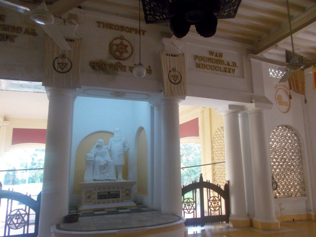 El edificio principal de la Sociedad es de factura reciente y carece del glamour de su sede europea (que está en un callejón sin salida junto a la torre Eiffel). En su interior, relieves que homenajean a las grandes religiones (algunas de las cuales disponen de templos en las más de cien hectáreas del recinto. Dato significativo, sólo el hindú permanece abierto todo el día), con énfasis en los cultos mistéricos de la Antigüedad (mitraísmo, orfismo…), banderas de todos los países con membresía teosófica y bustos de líderes prominentes. Krishnamurti, por supuesto, ausente. Otra ausencia notable es la de la cultura judía: es difícil dar con otra referencia que la omnipresente estrella de David, que en estas latitudes es conocida como un poderoso yantra que acaso antecede a David. No sólo los teósofos han escrito sobre este símbolo primordial; en cuanto a las razones de la exclusión de los judíos, prefiero no especular. La casa de publicaciones oferta más libros sobre el místico tamil Ramana Maharshi que sobre algunos de los protagonistas de la aventura teosófica. Todos los empleados en contacto con el público son indios, aunque el actual presidente no lo es.