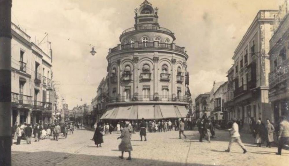 Llámenlo regionalista o historicista, como se suelen denominar muchas de las obras del arquitecto sevillano Aníbal González. En este caso, según afirma el doctor en Historia del Arte Fernando Aroca Vicenti, el Gallo Azul tira hacia algo más clasicista, como denotan su porte y sus columnas de mármol blanco del primer cuerpo y las pilastras de los balcones de los pisos segundo y tercero. Lo cierto es que el parecido estético del Gallo Azul con otras obras de Anibal González es evidente y pensando en ello, me vienen al recuerdo algunas de sus casas sevillanas, como la de la calle Pureza del barrio de Triana.