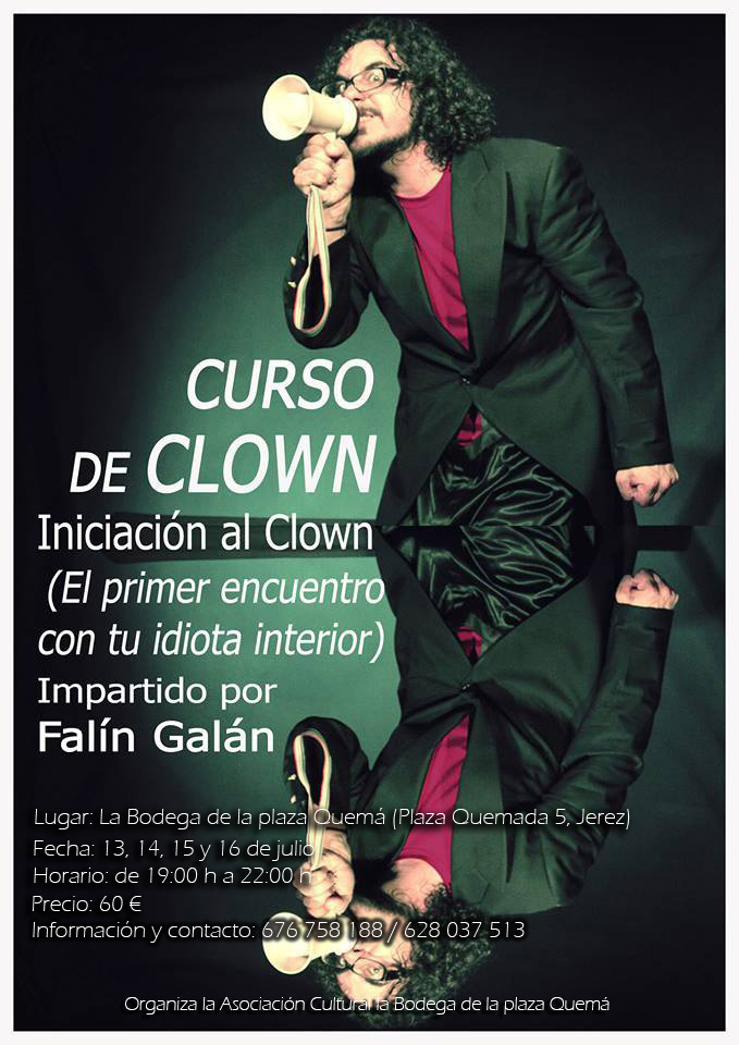 La figura del payaso ha estado ligada a la risa desde siempre. Para Falín M. Galán, ser un payaso o clown es una filosofía de vida que permite mostrar las miserias de la realidad mediante la nobleza y honestidad del ser humano. El jerezano, fundador de la compañía El Calvo Invita, es un artista multidisciplinar con una amplia experiencia en el mundo de las artes escénicas y la interpretación. Desde hace algunos meses ha llevado a cabo por Andalucía un curso de iniciación al clown para todos los interesados en este tipo de arte. La Quemá es el lugar en donde Falín M. Galán impartirá este curso durante el próximo mes de Julio y en el que espera que los alumnos asistentes logren descubrir su propio payaso interior además de reconocerlo.