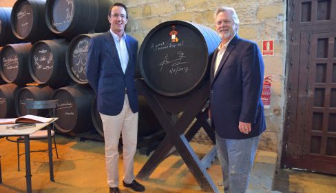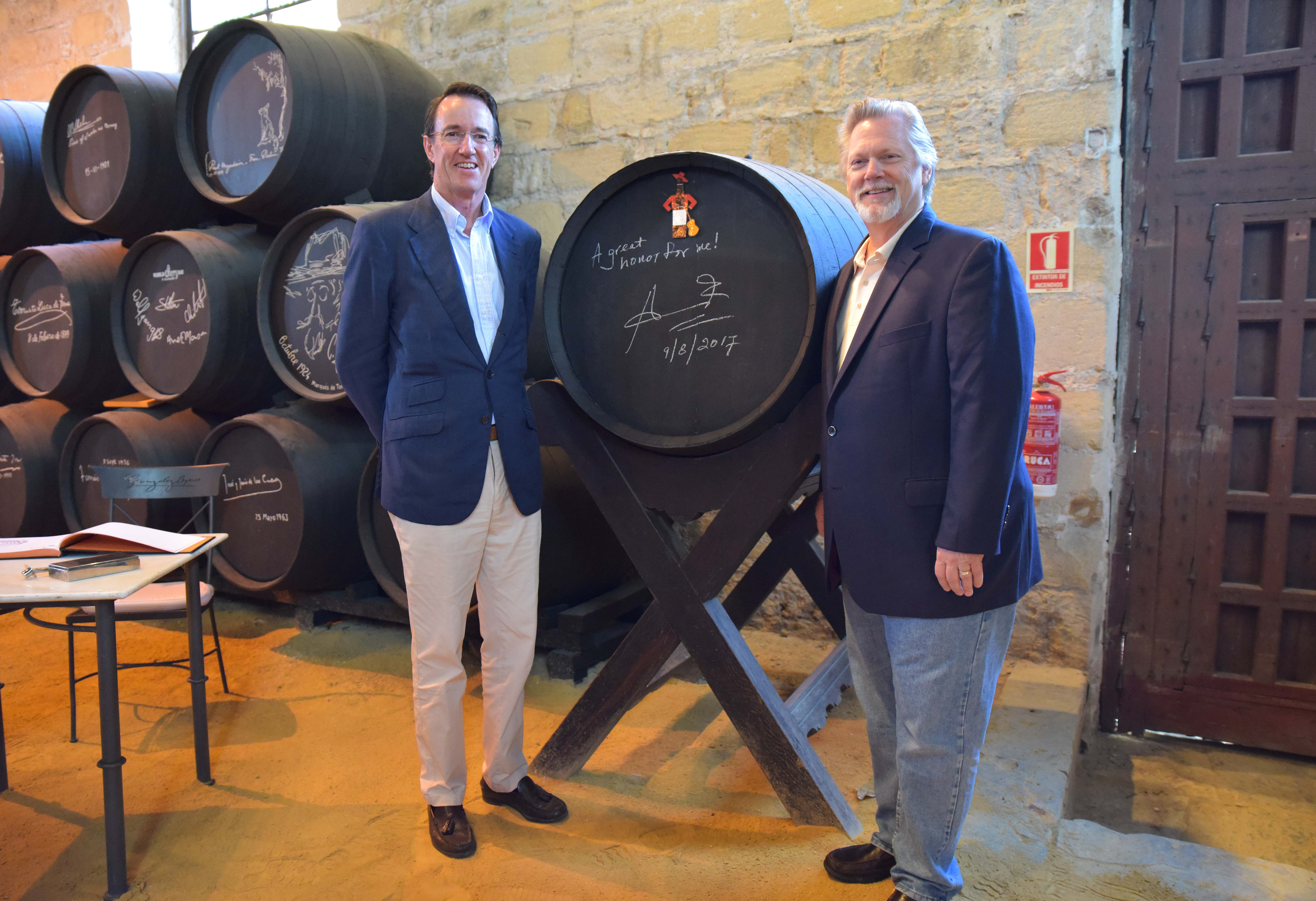 “Es un gran honor para mí” es la dedicatoria que ha dejado impresa en una bota de González Byass el cantante norteamericano Gregory Kunde. En la víspera del recital que ofrecerá para inaugurar el IV Tio Pepe Festival, este jueves 10 de agosto a partir de las 21:00 horas, el prestigioso tenor ha visitado la bodega junto a Mauricio González-Gordon, presidente de González Byass y miembro de la quinta generación de la familia.