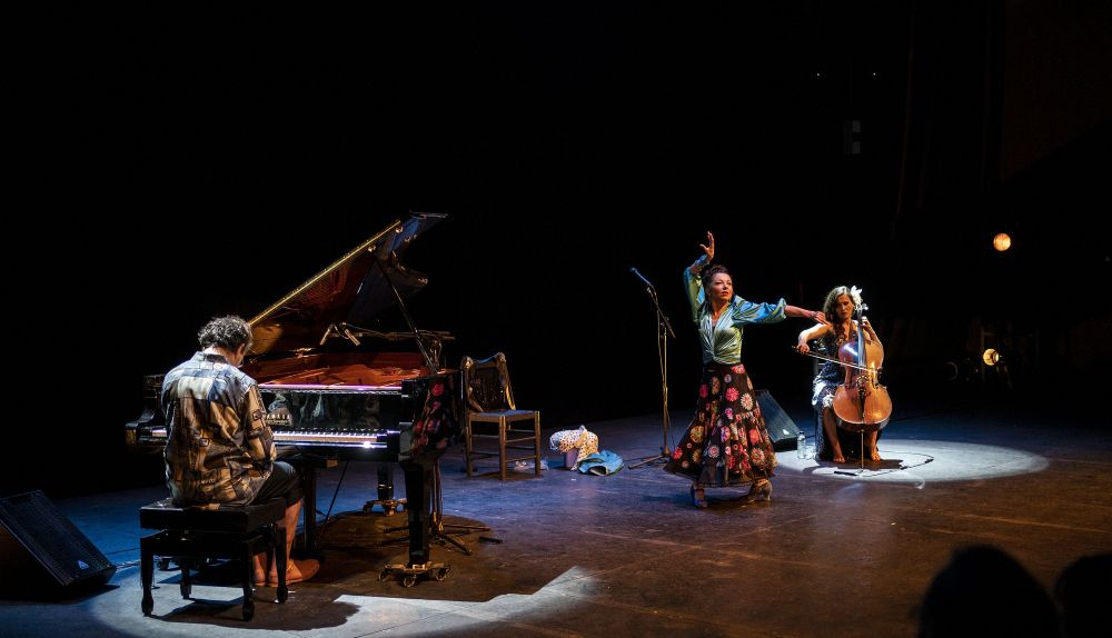Podríamos simplificar diciendo que se trata de un concierto más bien jazzístico, contemporáneo en un amplio espectro, pero danzado sin complejos y bailado flamencamente. En origen, la composición musical es anterior a la obra. Douze flâneries sur plages (La Mar Sonora, 2021) son doce composiciones del pianista Javier Galiana, inspiradas en paseos por distintas playas, que cobraron belleza y una forma definitiva con el concurso de la chelista Alba Haro. Los dos soñaron con que esta creación pudiera ser bailada: han visto cumplido su deseo gracias a la capacidad de metamorfosearse, de adaptarse y mimetizarse con la música, de la bailaora Rosario Toledo. También a sus conocidas capacidades dramáticas a la hora de trasladar sentimientos y estados de ánimo a la danza, en obras como la celebrada Aleluya erótica, Giraldillo al mejor espectáculo de la Bienal de Sevilla en 2012.