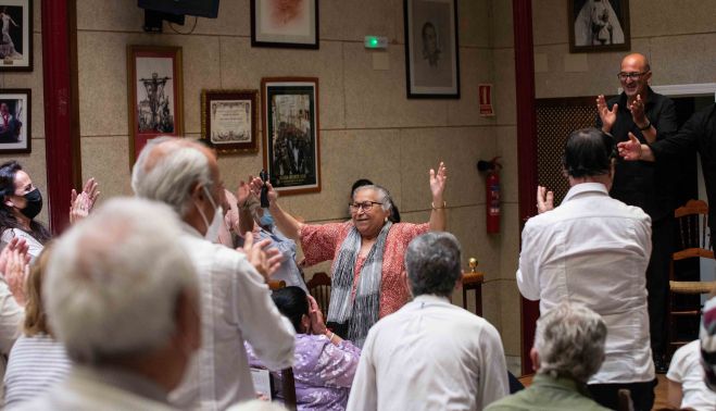Lleva como socio desde el año 1938, y a sus 88 años, con guayabera rosa y copa de fino en mano, sigue a pie de peña, recordando historias y disfrutando del flamenco desde un lugar privilegiado, y es que tiene un sitio de honor en el reservado junto al escenario. “Te voy a contar una historia muy bonita: un grupo de vecinos del barrio fuimos a la playa de El Puerto de Santa María a coger chinos para hacer el suelo de la primitiva peña, un local que estaba aquí al lado. Fuimos con los canastos y volvimos llenos de piedras”, nos cuenta Manuel, quién fundó, desde el suelo, esta legendario lugar.