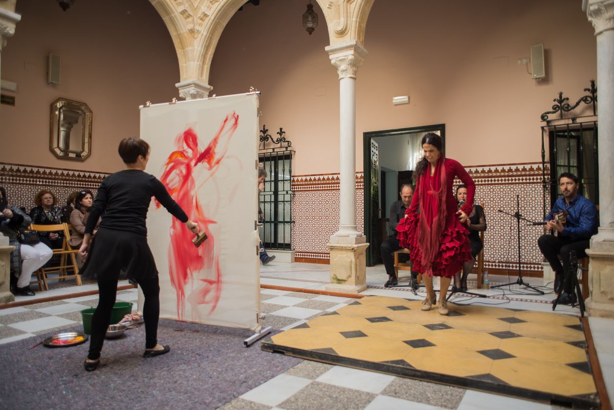 La artista alemana Sandra Hundelshausen inaugura una muestra en el Centro Andaluz de Flamenco una 'performance' en la que fluyen su pincel y el arte jondo en directo
