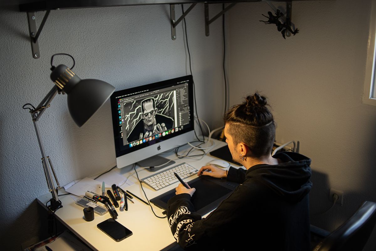 En Jerez hice el bachillerato de Artes y en paralelo me estuve formando desde los seis o siete años con un profesor que es mítico, como es Alberto Belmonte. Estuve durante 10 años y después me fui a la Escuela Joso —un centro especializado en cómics y artes visuales—. Barcelona me atraía por el ambiente del mundo del cómic que tiene y con 19 años me fui solo para allá. Luego hice un máster. También estuve trabajando en una empresa juguetera, hacía portadas de libros para la editorial Insólita, daba clases online… Estuve sobreviviendo, porque lo que se gana es muy random. Hay trabajos bien pagados y otros no tanto.
