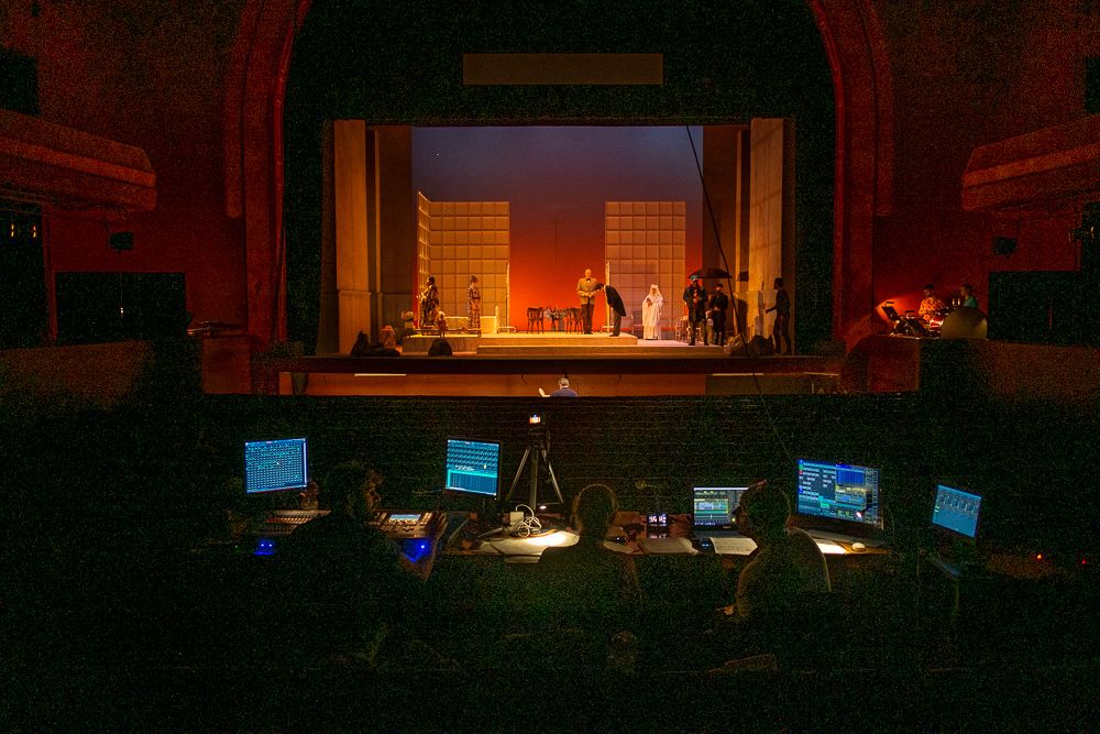 Mesa técnica al final del patio de butacas del teatro, en un momento del ensayo del segundo acto de la ópera de Puccini. FOTO: MANU GARCÍA