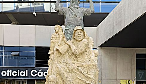 En la parte trasera, sobre un muro que imita en su material constructivo la piedra ostionera, aparece en alto el escudo del equipo de fútbol en relieve.