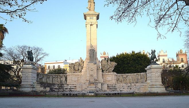 Detrás, un alto pilar cuadrangular con cuatro pilastras adosadas y unidas entre sí, de fuste liso y capitel jónico, rematado por un entablamento corrido. En el frontal, en versales adosadas en bronce, "1812" y en la parte posterior, "Cádiz".